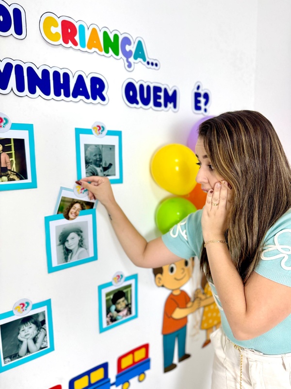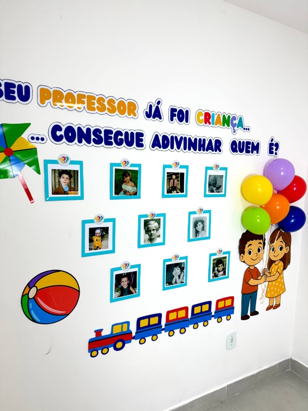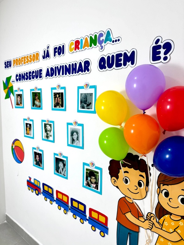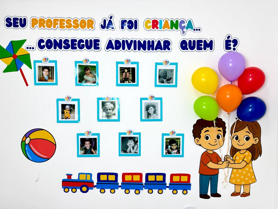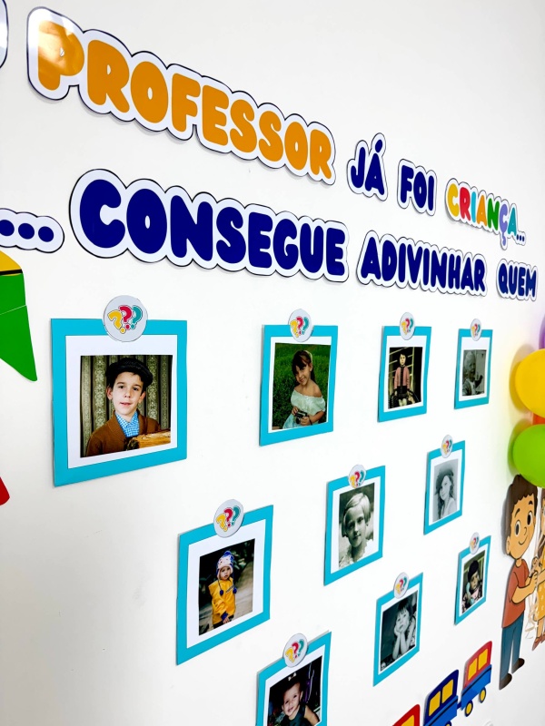 Nosso Painel Interativo vem com vários cards: na frente, a foto do professor quando criança, ao puxar o card, aparece a foto atual!